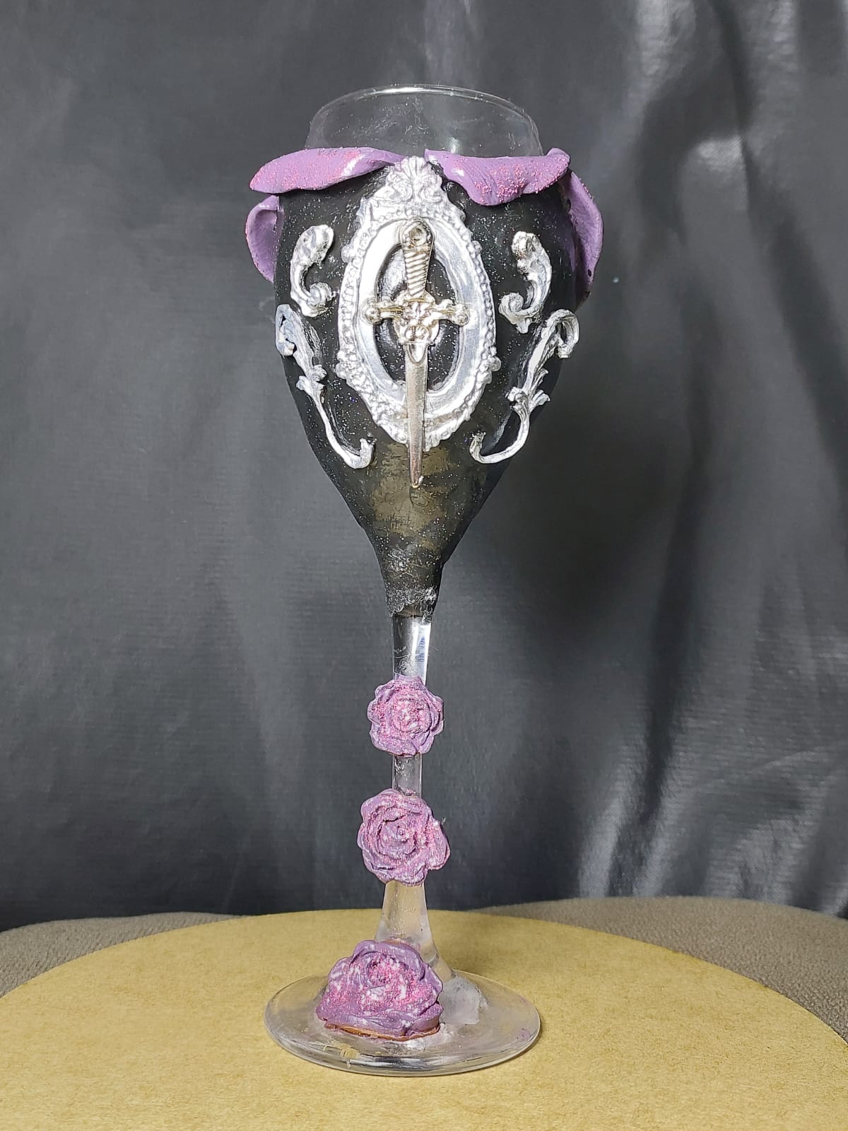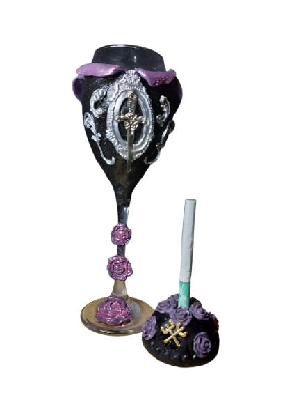Taça de vidro personalizada em biscuit, resistente a água, com pingentes e pedrarias! Ideal para Pombogira “Maria Mulambo, Maria Quitéria…” Cores predominante nessa taça (roxo, preto, prata ou dourado)
